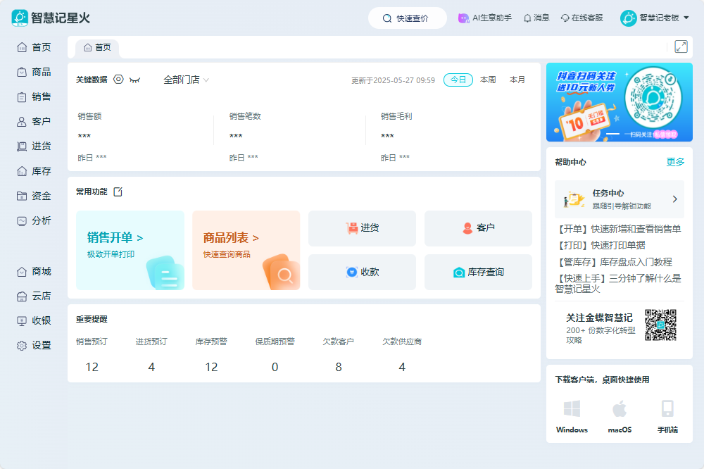 金蝶智慧记星火进销存是金蝶智慧记全新升级版本,以进货、销售、库存、进销存管理为核心,是集进销存管理记账、仓库库存管理预警、进出货管理、开单、盘点、库房管里、仓库调拨、远程批次开单、自定义批次打单、生产管理、财务记账、报表分析于一体的软件系统,帮助店铺进行商品管理、出入库管理、仓库管理、店铺管理、员工绩效管理、销售管理等生意经营活动。
