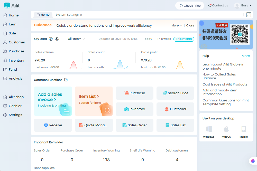 智慧记国际版(Ailit),是金蝶智慧记专为全球批发零售商户打造的专业进销存软件。帮助店铺进行商品管理、出入库管理、仓库管理、店铺管理、员工绩效管理、销售管理等生意经营活动。支持多语言与多币种等境外经营场景;功能全面,简单好用。智慧记现已覆盖100+国家与地区,成为30+细分行业、300万批零商户的共同选择。