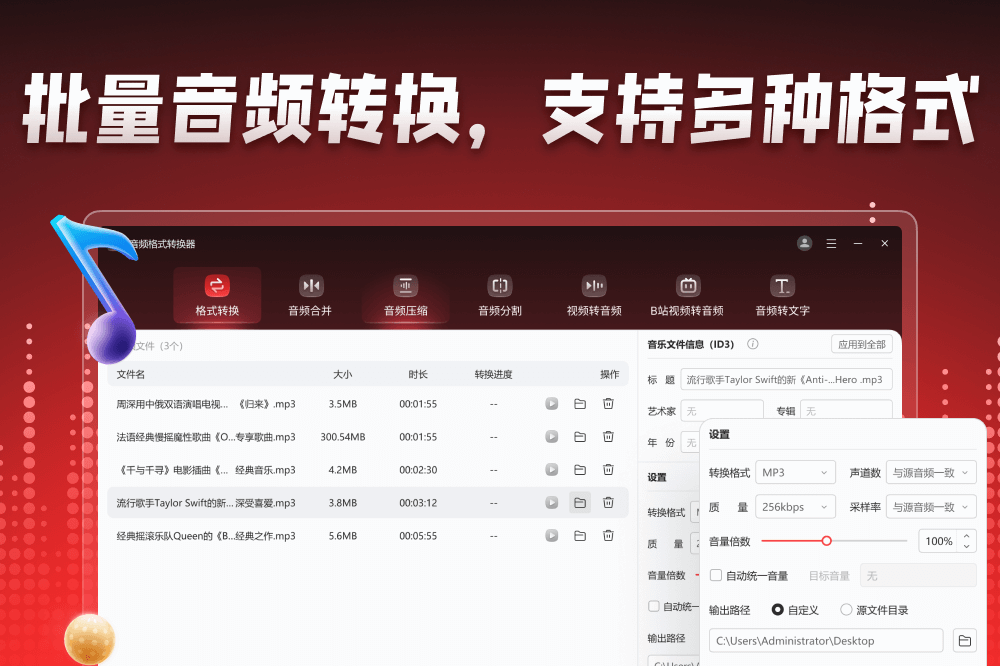 2、音频编辑:具备音频分割功能,能精准拆分音频;支持音频合并,可将多个音频文件无缝衔接;还支持音频压缩,在保障音质的同时,可设置不同的音频压缩体积,满足不同场景的压缩需求。