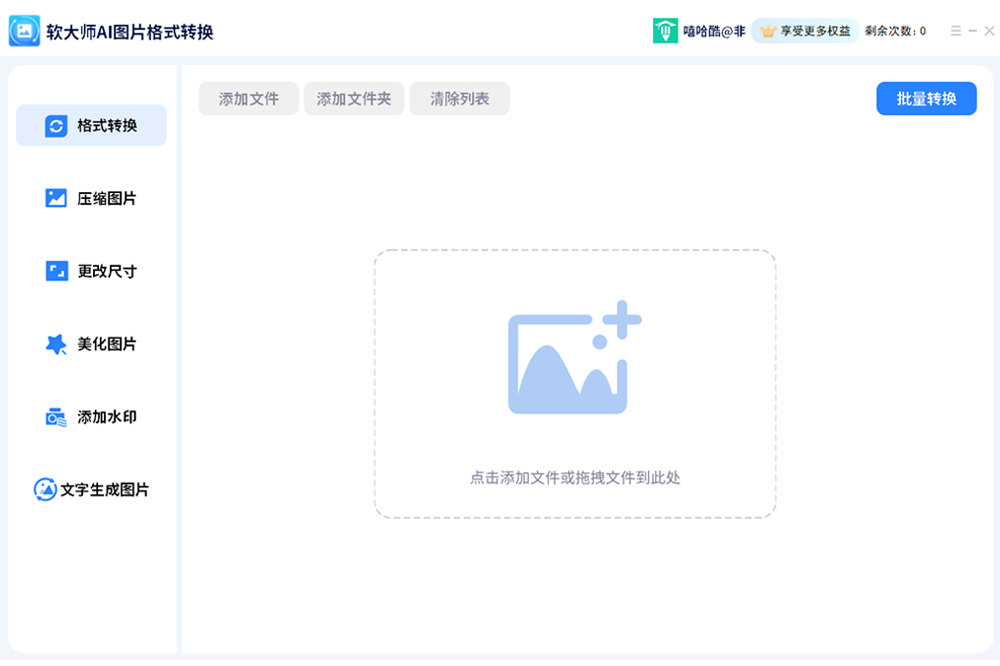 软大师AI图片格式转换(360专版)软大师AI图片格式转换是一款专业图像处理工具,支持常用格式无损互转。集成压缩技术,最高缩减体积95%保持画质;提供像素级尺寸调整与内容感知裁剪;具备一键美化功能;支持文字/图形水印精准添加;内置文生图引擎可依描述生成高清图像。