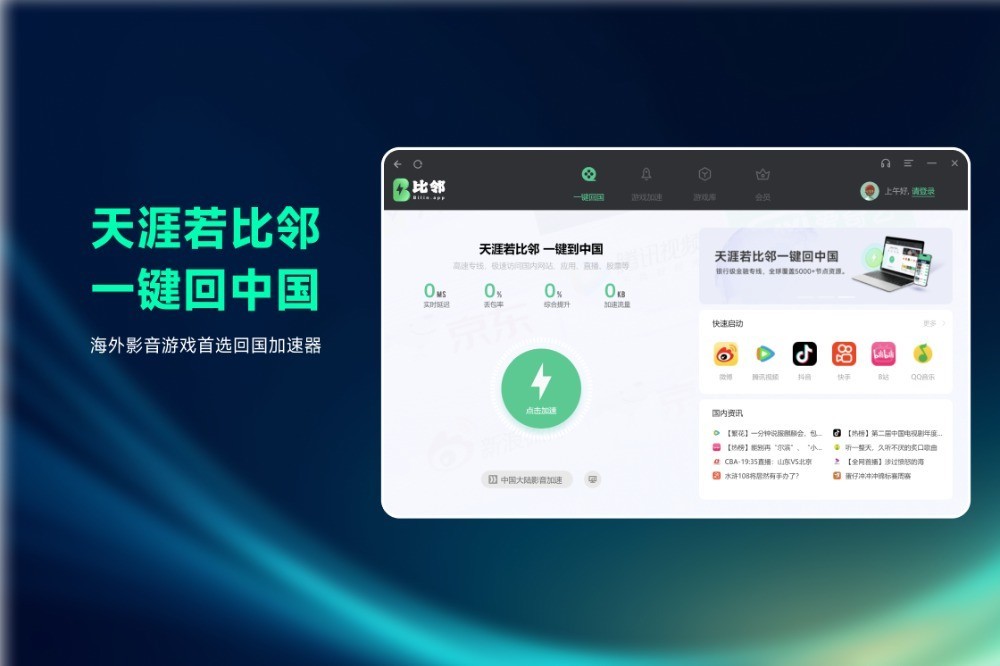 比邻加速器是一款专为海外华人、留学生、差旅人士打造的海外回国加速器。每年服务全球千万用户随时随地高速稳定,低延迟的畅玩国服游戏、观看高清视频、听高品质音乐、办公炒股的必备神器。