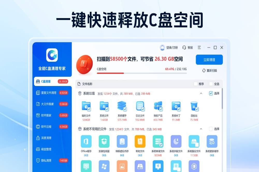 全能C盘清理专家,支持一键快速清理C盘空间,支持扫描和清理更多的“垃圾文件”类型和格式,支持C盘安装软件搬家、重复文件批量清理、大文件批量搬家等,操作简单,清理快速且高效。