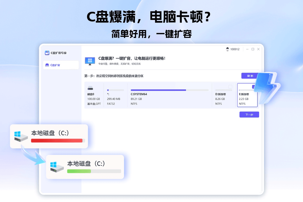 C盘爆满导致蓝屏、卡顿? 幂果C盘扩容助您轻松解决!专业硬盘分区工具,只需简单几步,就能安全地将其他盘的空闲空间“挪”给C盘,快速缓解空间压力,告别系统异常!