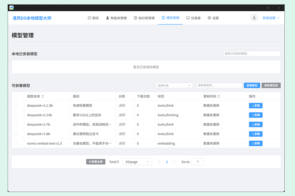 - 高效模型管理:支持多模型一键部署、动态切换与性能监控,清晰展示已安装/可部署模型列表,模型下载、更新状态直观可控。