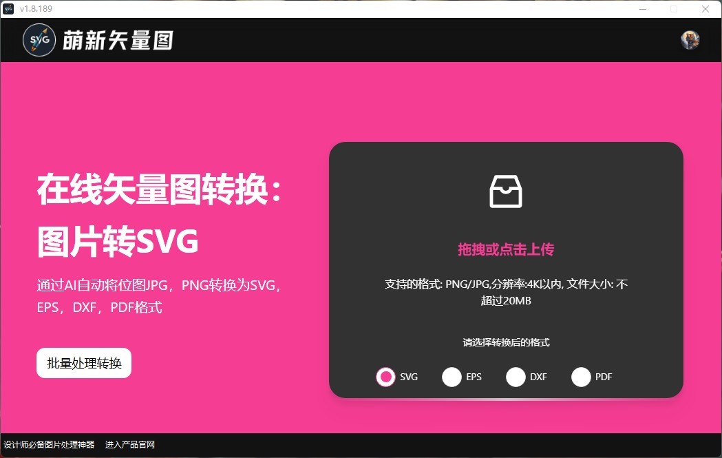 萌新矢量图转换器工具小巧睿智、高效易用。一键在线将JPG、PNG图片自动转换SVG(.ai),EPS,DXF(.dwg),PDF四种格式,生成的矢量图像放大数千倍仍颜色艳丽、边沿清晰不丢失细节,支持Adobe Illustrator、CorelDRAW、Autodesk AutoCAD等设计软件进行再次编辑修改,用最低的成本提升设计领域的工作效率。