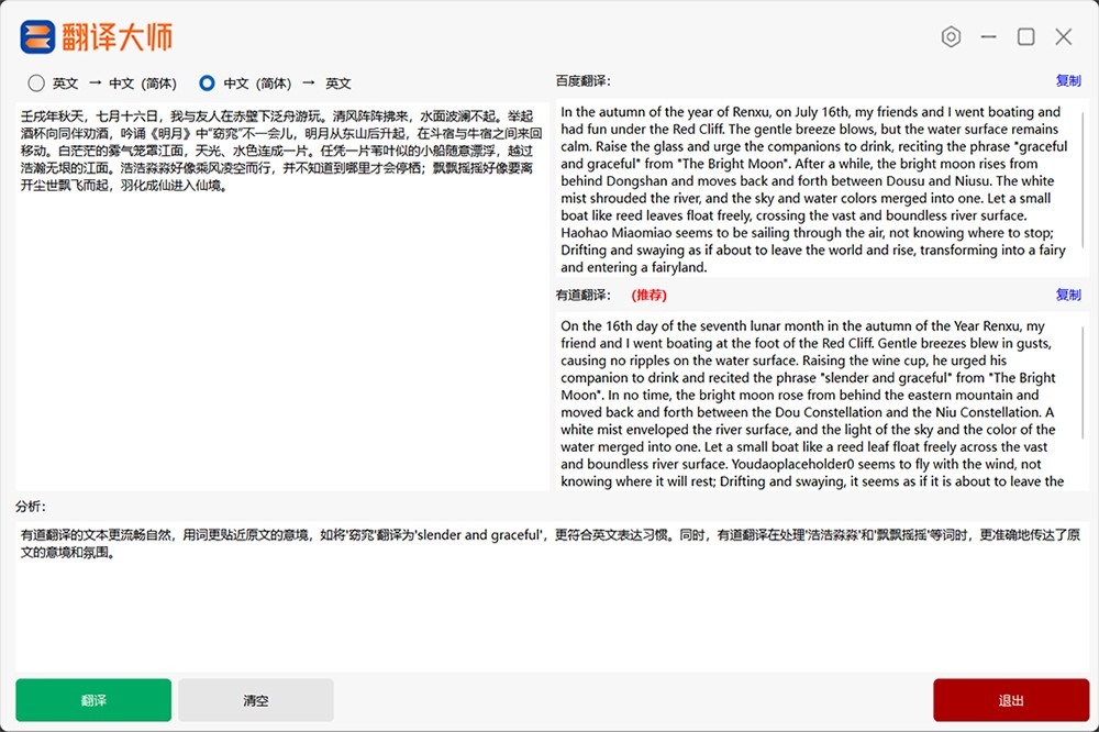 “明远翻译大师”是一款专注于翻译领域的专业软件,致力于为用户提供高效、准确、便捷的翻译服务。其核心功能围绕中英、英中互译展开,通过调用多个先进的AI翻译工具,打破市面现有翻译工具单一翻译能力的局限性,为用户呈现多元化的翻译结果,并对这些结果进行深度分析和对比,最终为用户推荐最合适的翻译内容,满足不同用户在学习、工作、生活等多场景下的翻译需求。