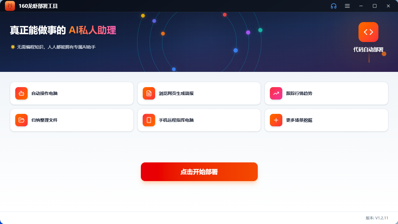 160龙虾部署工具一款面向个人用户的跨平台一键部署工具。通过自动化流程和智能配置向导,帮助您解决手动部署过程中可能遇到的技术壁垒,轻松在自己的电脑上部署和使用