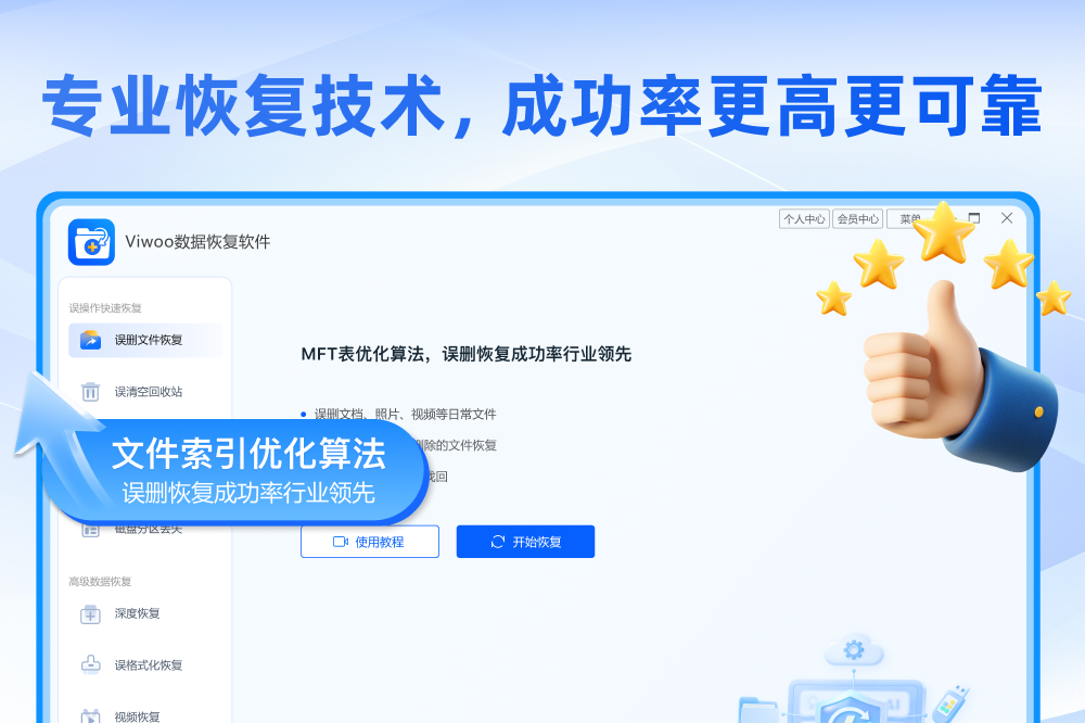 误删文件恢复,格式化数据找回,U盘数据恢复,硬盘数据恢复,回收站清空还原,内存卡/相机卡文件修复,照片视频恢复,办公文档找回,Viwoo数据恢复软件是一款安全、高效、专业的全能数据恢复工具,致力于为用户提供全面而便捷的丢失数据找回解决方案。软件集合了误操作数据恢复、格式化文件修复、多设备数据还原、全格式文件找回、智能极速扫描、可预览恢复等功能于一体,可以帮用户轻松解决误删除、误格式化、分区异常、设备打不开、病毒破坏等各类场景下的数据丢失问题,精准找回文档、图片、视频、音频等各类文件,守护用户的数字资产安全。
