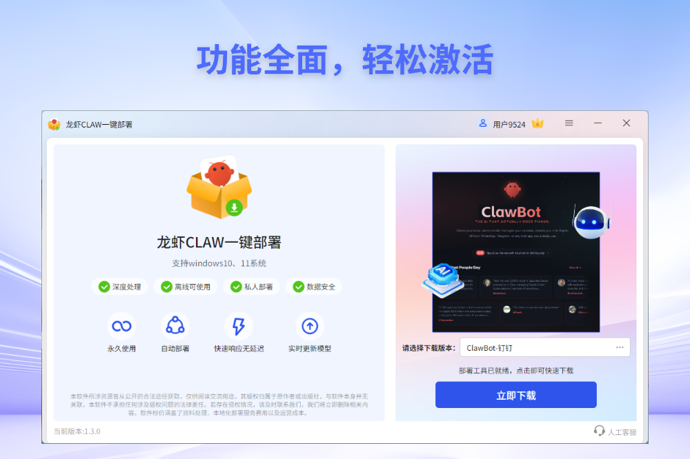 杂云端服务,降低个人开发者与小团队的使用门槛。无论用于本地调试、私有化部署还是离线运行,龙虾Claw本地部署工具都能大幅提升部暑效率,让用户专