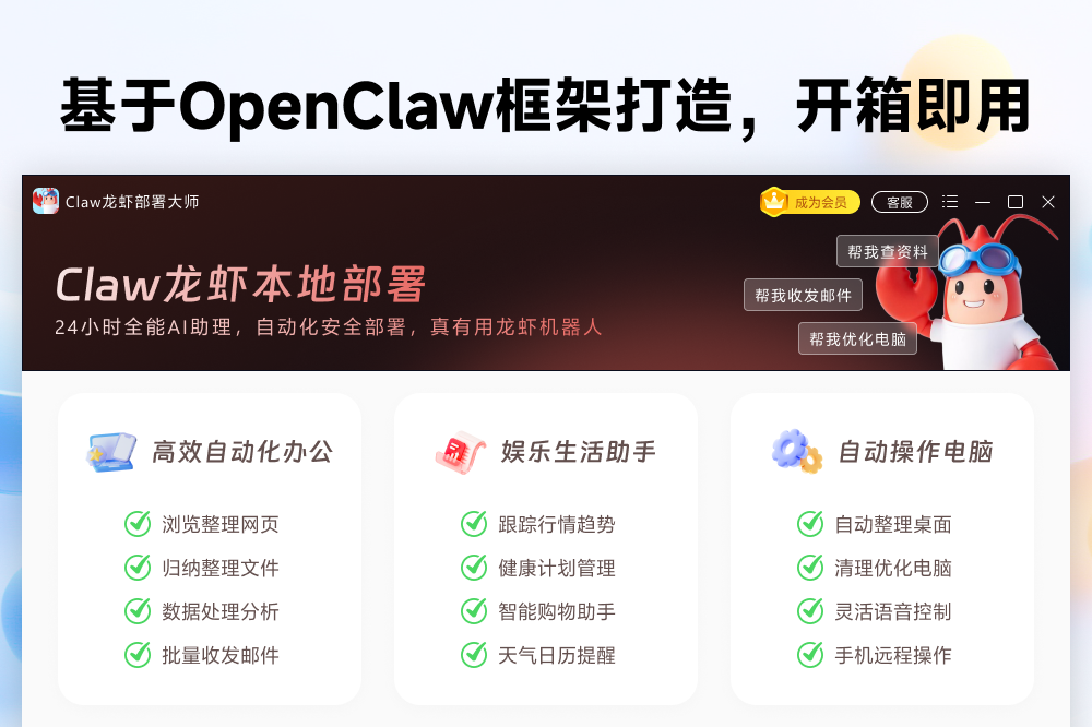 零门槛一键部署OpenClaw,7*24小时全能AI助理轻松上手 深度定制优化,界面、文档全部中文汉化,开箱即用 无需连接云端,本地部署,保障隐私安全 全面支持豆包、千问、DeepSeek等优质平台 全能AI助理,助您高效办公