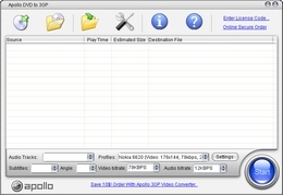 Apollo DVD to 3GP是一款创新的媒体转换工具,可直接将你喜爱的DVD影片转换为手机3GP视频格式,不管DVD是PAL或NTSC都可以进行转换。