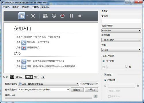一款可以让你在不需要安装微软PowerPoint软件的情况下,快速方便的将幻灯片转换为常见的视频文件格式的转换工具,它可以转换幻灯片到AVI,MOV,WMV,MP4,H.264,HD AVI ,HD H.264,和HD MPEG-2 TS格式的视频文件。 也可与移动数码设备结合将转档后的影音文件在iPod/iPhone/PSP/BlackBerry上播放。