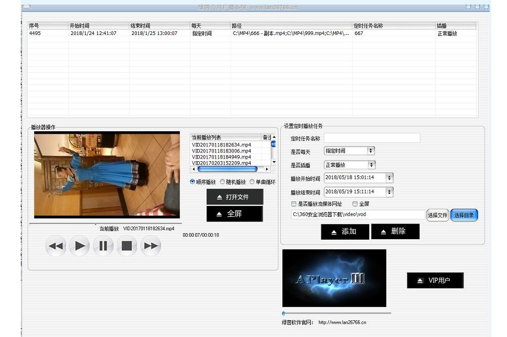 视频定时播出软件, 全自动视频播出工具,支持全部视频格式,已广泛使用于全国各类学校,在公共广播和视频播放工作中,得到了用户的一致好评. 软件简介: 视频定时播出软件是专业的用于厂区广播、校园广播、楼宇广播中的定时音乐及视频播放器,具有音乐定时播放、视频定时播放、定时事务提醒,定时开关机等功能。 高度智能,时间精确,可以设置多达1024组播放列表,是目前市场上最方便易用的一款智能播放软件.
