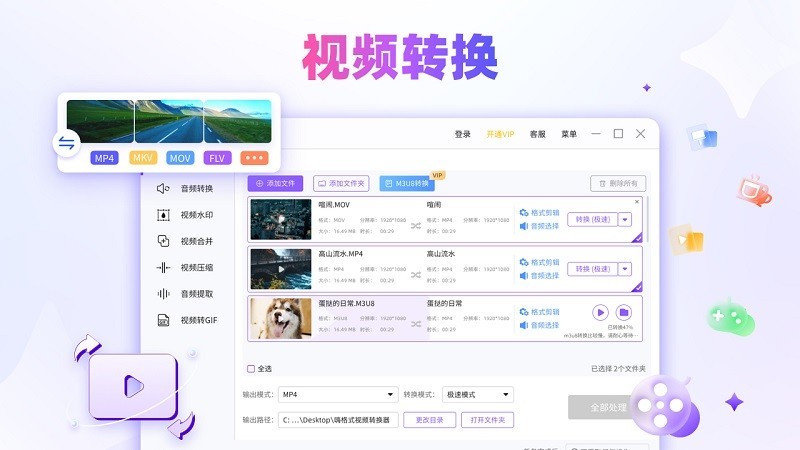 MOV转MP4,AVI转MP4,FLV转MP4,MKV转MP4,WEBM转MP4,M3U8转MP4,M4V转MP4等视频格式转换。