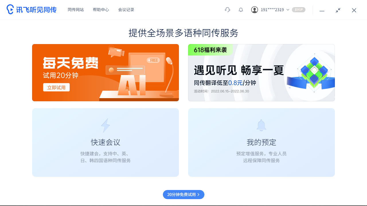 讯飞同传,基于科大讯飞的智能语音和语言技术,提供多场景多语种实时转写翻译、同声传译、直播字幕上屏和会议记录分享等一体化同传服务。