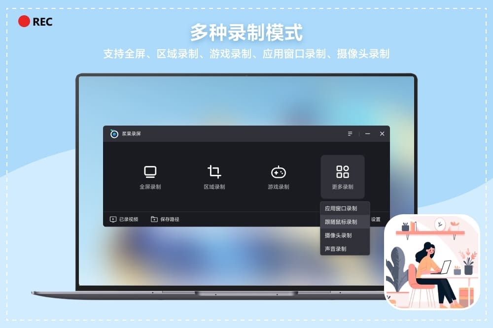 浆果录屏目前支持全屏、窗口、区域录制,包括但不限于录制游戏、课程、直播等。