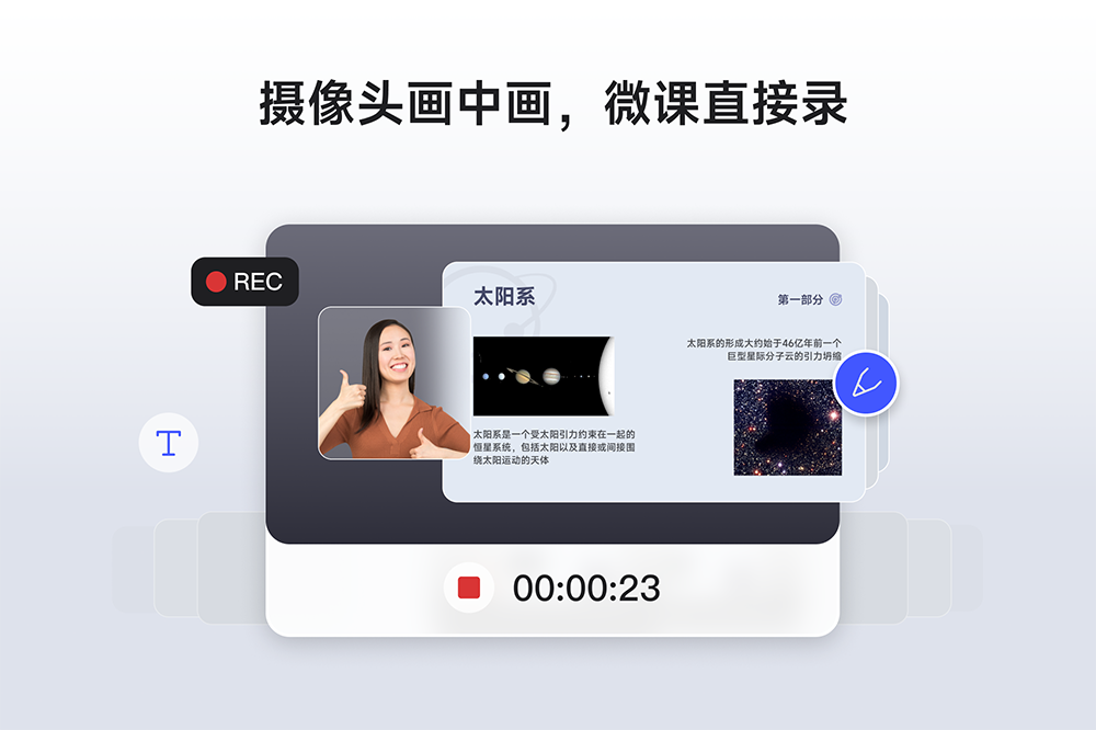 通过添加PPT/PDF/图片并搭配人像,即可轻松录制演示视频、教学视频、或微课。 你也可以设置美颜/虚拟背景/贴纸等特效,搭配 ClassIn/腾讯会议/钉钉使用,让教学/演示讲解更专业、更有趣。 【应用场景】