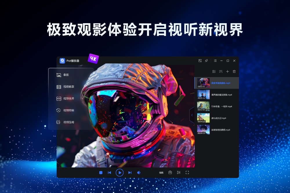 全能王Pot支持网络上所有主流的视频音频格式文件,是一款非常优秀的影音全能格式播放器。支持32位和64位系统。内置硬件极速解码,支持MPEG1/2(IDCT/MoComp),WMV2(MoComp),WMV3(IDCT/MoComp),H.264/AVC1(VLD),内置 E_AC3 音频解码。网络流媒体播放支持。