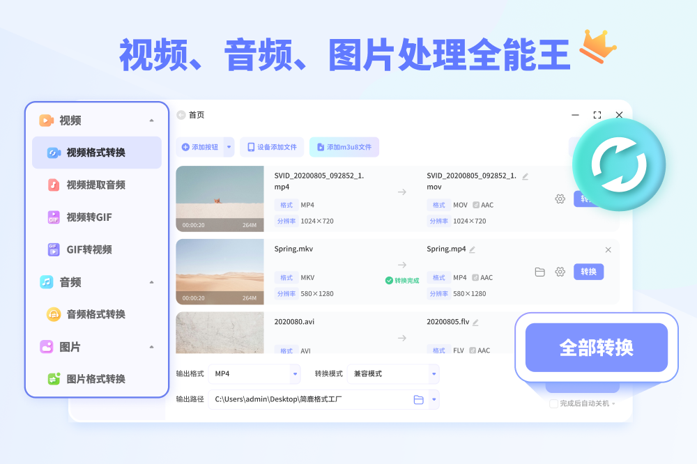 简鹿格式转换工厂,旨在帮助用户轻松转换视频、音频、图片文件的格式。以下是该软件的主要功能介绍: 格式工厂:格式化工厂、格式转换工厂,超多格式一键转换。 视频格式转换:视频转换器、视频格式转化、各种格式转mp4、MOV转mp4、gif转mp4,支持多种视频格式转MP4。 视频提取音频:视频转mp3,音频提取器,提取视频中的音频。 视频转GIF:mp4转gif,gif转视频。 GIF转视频:gif动画格式转换为视频格式。 音频格式转换:音频转换器,音频转换mp3,mp3转换器。 图片格式转换:图片格式转jpg、图片转格式、图片转换格式、图片格式转换器。 批量转换:同时转换多个文件,点击批量转换按钮即可。