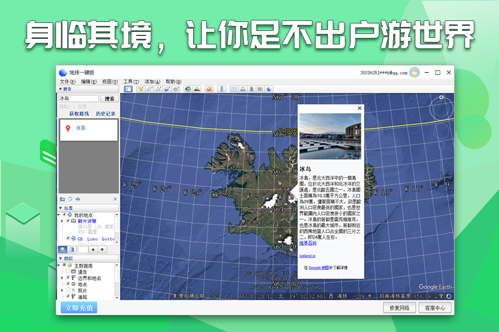 地球一键版可展示全球高清卫星影像、3D 地形与建筑,支持搜索、测距、查看街景及历史影像等功能