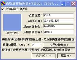 将您能在屏幕上看到的颜色转换成我们使用的数据颜色(网页颜色或者是R,G,B颜色),让您尽情的享用你喜欢的颜色。这个软件是免费的,解压后直接运行即可。