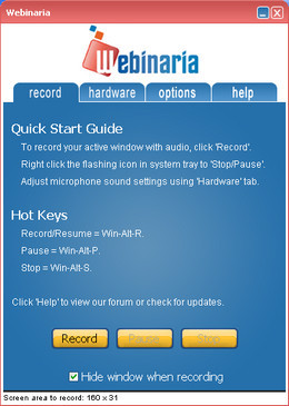 软件程序的设计简单易用,举例来说在安装后只要点击一个鼠标按键,就可以启动程序的屏幕捕捉。该软件配备几个选项的可以变化和调整某些方面的画面捕捉,例如在同一时刻记录音频对话(连接麦克风)和网络视频(连接摄像头),Webinaria屏幕捕捉软件会自动将这些添加进去。
