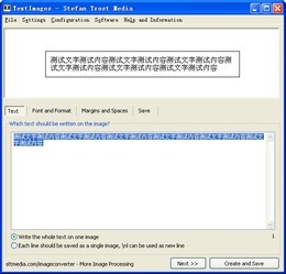 TextImages是一个文字转换成图片的工具,一边输入文字上面就会显示出相应的图片文件。在“Font and Format”可以调整字形字体大小和样式等;“Margins and Spaces”调整图形大小;“Save”设置输出;“Create and Save”储存为jpeg。