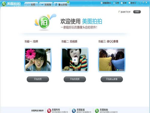 兼容所有主流摄像头的自拍软件。美图拍拍把电脑变成了相机和DV,可以轻松自拍大头贴,还能拍视频、做搞笑QQ表情等。美图拍拍有超多可爱素材,还有的摄像头优化技术,让你更加上镜!