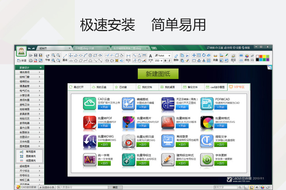 一款快捷、易用、且功能齐全的专业级家装设计CAD软件。软件小安装速度快,操作简单,完全脱离AutoCAD,兼容AutoCAD各版本;集家装户型设计、家居陈设、给排水、电气灯光、采暖空调等所有功能于一体,相比传统CAD,可以大幅提高制作各种家装平面设计图的效率;提供专业图库,图案填充、线图案等功能;转换功能,大大提高图纸转换效率,包括天正转换、PDF转CAD、批量转PDF、批量转图片和批量转版本等功能;标注功能强大,增加箭头引注、引出标注、剖切符号、图名标注等专业功能,填充图案、图形填色和测量面积支持智能识别图形边界,功能更好用;打印、导PDF和图片增加识别图框批量打印和导出,效率倍增。还包括云字体、智能3D等等黑科技,让你感受非同寻常的设计体验。免费赠送100M云盘,图纸安全同步,轻松分享。软件简单易用,既可作为室内设计师的专业工具,又能满足普通用户制作自己的家装设计方案,是Windows平台下必备的CAD家装设计专业工具。部分VIP功能需收费。