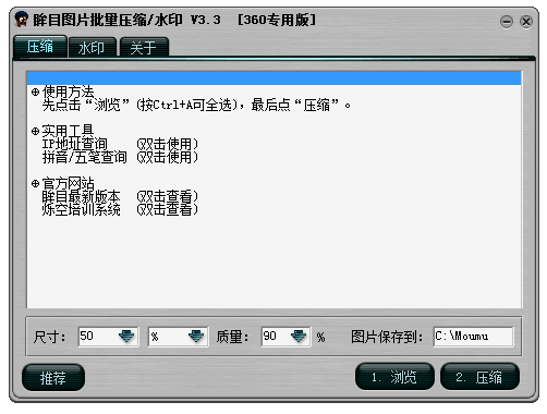 绿色无需安装的图片批量压缩工具。眸目图片批量压缩器的主要功能是用来批量压缩图片体积,用户能够在该软件主界面下侧看到一个“浏览”按钮和一个“压缩”按钮,其中,“浏览”按钮用于向本软件中导入欲压缩的图片文件。在向眸目图片批量压缩器主程序中成功导入图片后,用户可以自行选择压缩尺寸、选择压缩质量、设置导出目录等压缩配置,配置完毕点击”压缩”即可对添加进主程序的图片文件进行压缩处理。