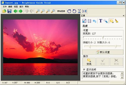 Brightness Guide是一款方便易用的调整照片亮度软件。该软件可以帮助用户调节图像的亮度和细节,同时支持剪切、旋转、重定义大小、添加文字、更改颜色等功能,让你轻松处理图片的清晰度。