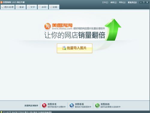 简单实用的网店批量图片处理软件。包括图片处理、添加装饰素材、边框、文字等图片处理的常用功能。美图淘淘可同时对多张图片进行处理,将原先需要重复劳动的工作一次完成,省时省力。