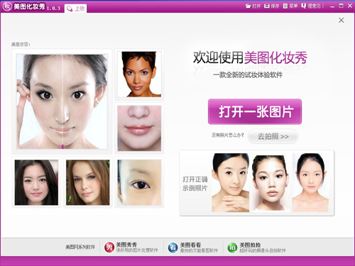 美图网旗下新推出的一款能模拟真实化妆的简易试妆软件。有了它,爱美的女性只要轻松点击、随意搭配出适合自己的妆容。将一张正面清晰照,在取点校色后点击“自动上妆”即可。还可以对眼睛、睫毛、唇部等地方自由搭配妆容效果。软件每周会根据时下ING妆容更新彩妆效果,此外软件还针对爱美女性开发了“整容”功能,可以细微修饰脸部瑕疵。