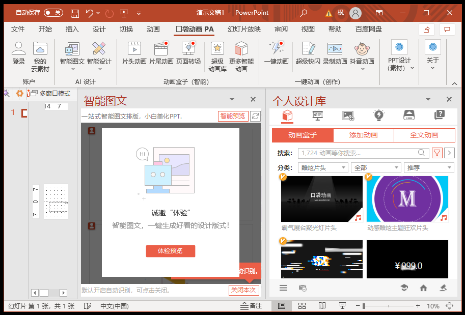 口袋动画(Pocket Animation,简称PA)是由大安工作室(作者:安少)独立开发出来的一款PowerPoint动画插件,致力简化PPT动画设计过程,完善PPT动画相关功能,一个真正意义上分享型插件。口袋,分享你我,PA一下,动画就好。