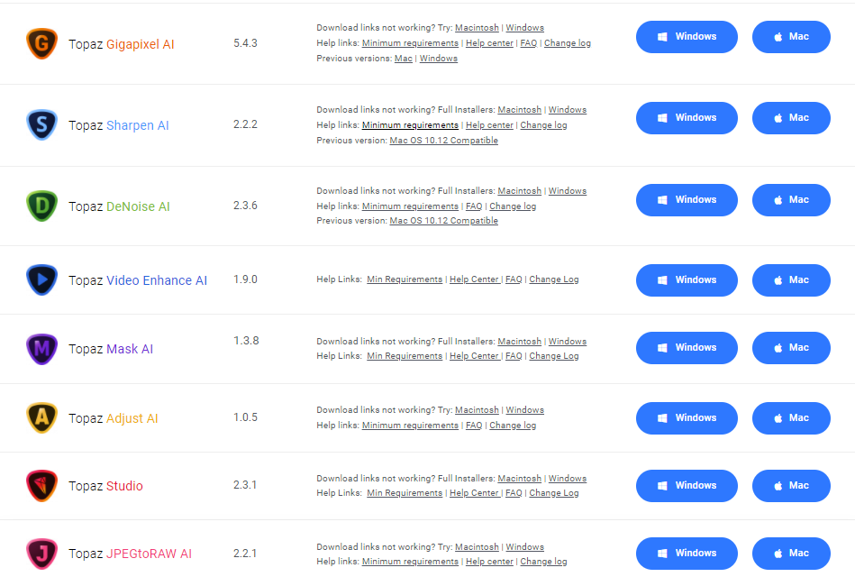 系列软件包含以下多个在线安装包:Topaz JPEGtoRAW AI 、Topaz Adjust AI 、Topaz Studio、 Topaz Mask AI、 Topaz DeNoise AI 、Topaz Sharpen AI 、Topaz Gigapixel AI