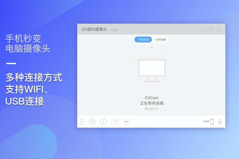 EV虚拟摄像头,让手机秒变电脑高清摄像头和麦克风。支持WIFI无线连接/USB有线连接,即开即连。超低延迟,高清画面,支持麦克风传输,兼容主流录屏直播软件。连接成功,手机一键变成电脑摄像头和麦克风虚拟外设。