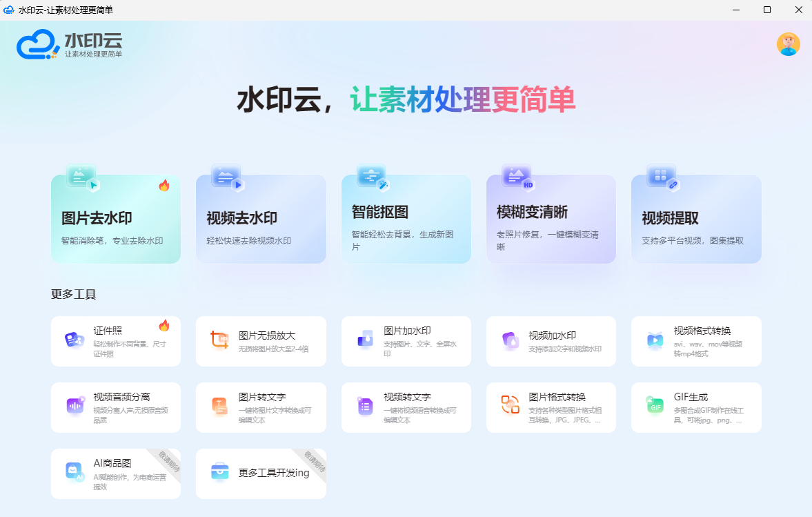 桌面端多功能支持批处理,其中包含【图片去水印】、【视频去水印】、【智能抠图】、【模糊变清晰】【视频提取】、【图片加水印】、【视频加水印】、【图片格式转换】、【图片无损放大】等