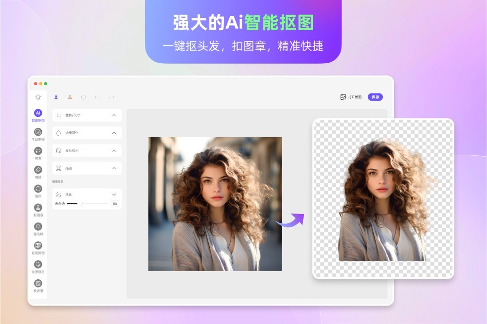 一键抠图,智能识别图片完成AI抠图,精细度覆盖至发丝级别,专业抠图工具。