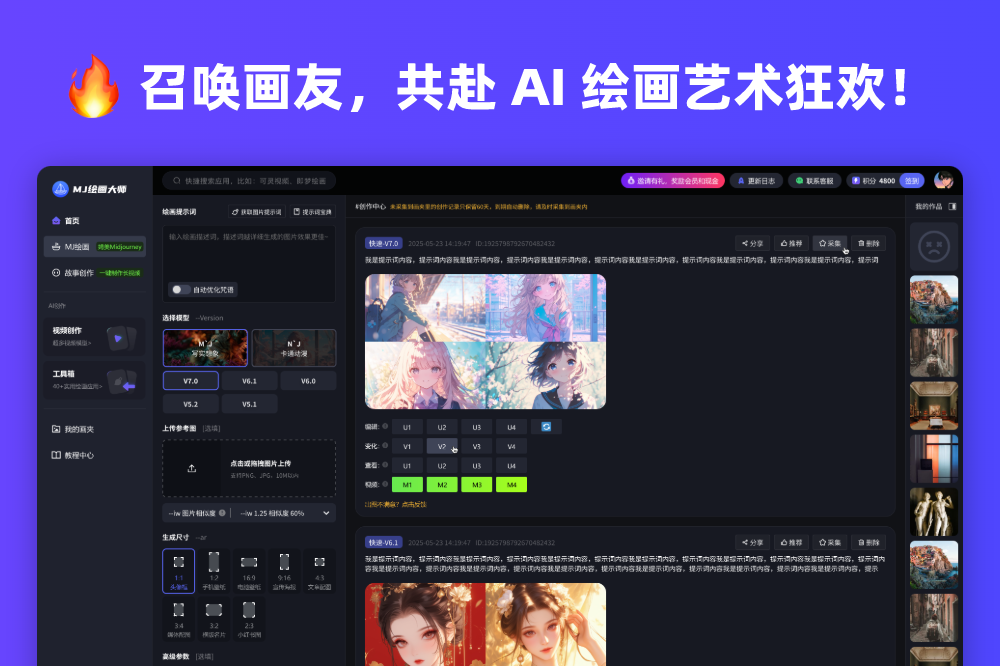 MJ绘画大师是一款AI人工智能绘画软件,用户输入语言指令即可自动生成各种风格的绘画图片。Mj绘画大师功能强大、使用方便,支持各种尺寸的图片输出。MJ绘画大师内置系统工具箱包含各种主流功能如图片编辑工具:支持图片无损放大,老照片修复,AI智能抠图,黑白照片上色,图片去水印,图片转素描等。电商设计工具:线稿渲染,模特换装,AI抠图去背景,营销海报图等。创意应用工具箱:支持AI艺术字,人物转动漫,故事连环画,创意二维码,AI一键扩图,AI换脸,线稿一键上色等。除此之外,MJ绘画大师还包含AI视频模块,支持文生视频以及图生视频功能可以将文本和图片转换为高质量AI视频,适用于多种场景,如抖音短视频、小说推文、AI短片、AI电影等创作。