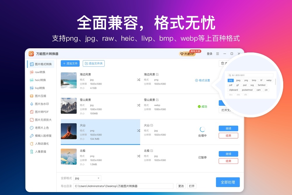 万能图片转换器是一款操作简单、功能齐全的图片格式转换软件: 1、图片格式转换 支持百种格式,jpg、jpeg、png、bmp、tif、tiff、webp、gif、psd、svg等一键转换,还支持苹果HEIC图片转换、图片转PDF 2、图片压缩 高清无损批量压缩 3、图片加水印 海量水印模版随心选 4、创意玩法 无损放大、老照片上色、模糊人脸修复、人物动漫化、人像素描等 5、专属客服,随时为您答疑解惑