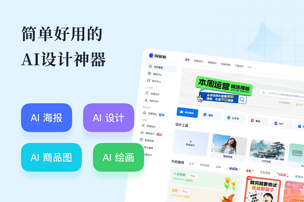 创客贴设计--智能在线设计工具,AI海报图片设计、拼图抠图作图神器“打工人”必备AI作图神器 创客贴设计为用户提供丰富的AI智能作图工具,如AI海报、AI商品图、智能抠图、AI消除、智能改图、AI绘画等,输入一句话AI即可帮你完成设计,上传一张图片AI帮你智能修图改图。还有丰富的商用模板素材,包含海报,宣传单,公众号首图,小红书封面配图,电商海报,直播间素材等多种应用场景,只要“改字换图”就能快捷生成专业设计。让设计触手可得,让设计更高效! 创客贴企业版,专为企业内容生产而打造,解决企业设计费用昂贵,制作周期长及版权等问题,同时提供企业内容资产管理平台,让内容资产流转更高效,还有团队协作,审批等功能,规范品牌管控,提升企业营销效率! 【海量模板素材,高清图库】 「海量资源」50w+精美模板,8000w+高清图片,15w+原创插画及素材,上千款可商用字体无限畅用 「精美模板」海报、长图、日签、公众号首图、小红书封面、简历、名片、邀请函,电商海报、手抄报、LOGO、壁纸、头像、朋友圈封面等100+场景。无论是企业营销、微信生态、电商引流、行政办公还是自媒体创作,都能轻松满足需求