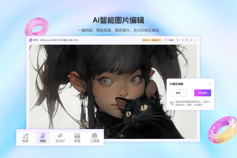 看图啦(AI版)支持多达98种图片格式、看图流畅速度快,同时具备图片编辑、转格式、转PDF、高清打印、AI变清晰、抠图、消除、压缩、多图批量处理等丰富而强大的图片编辑转换能力,结合AI图像算法,轻松搞定各种图片需求。 产品特点: 1. 多格式支持:支持JPG、PNG、GIF、BMP、WEBP、PSD等多达98种图片格式查看,全面覆盖日常办公和生活中的常见图片浏览需求。 2. 丰富图片编辑工具集:内置超多的图片编辑处理工具,结合先进的AI图像处理技术,让您的图片编辑美化更加简单高效。 3. 特色功能: 【图片编辑】:包含丰富图片编辑工具,支持图片裁剪改尺寸、加图文标注、加水印、调整色彩等,操作简单,高效改图。 【AI抠图】:一键实现物品抠图、人像抠图等,精准还原人像发丝细节。 【AI变清晰】:通过智能算法将模糊图片变清晰,还支持图片无损放大,提升图像画质。 【AI消除】:智能识别并一键消除图片中多余的元素或物体,让图片更加干净。 【AI去水印】:智能检测并一键去除图片中的水印,恢复图片原貌。 【图片高清打印】:支持单图和多图一键打印,具备一键高清、自动矫正图片变形、去除图片黑底等多种图像
