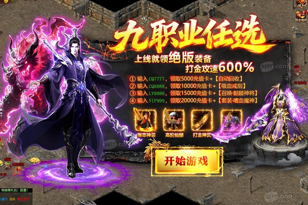 9377天尊传奇:九职业,让你体验超超超快感的传奇!专属千元礼包码免费送!礼包码:FLM666,VIP888。只需要体验10分钟,你会爱上它!万人在线沙巴克!自由组队战斗,兄弟集结,重聚沙城,点燃激情!