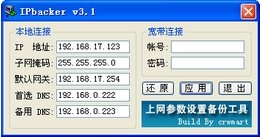 ADSL本地电脑上网参数备份还原软件。运行后它会将您目前电脑TCP/IP的设置还有ADSL的帐号和密码备份到D盘里,生成D:\宽带设置文件夹并备份上网参数,ADSL上网用户可以在创建连接后选择开机自动连接网络,支持WinXP SP2/SP3系统,希望大家笑纳。
