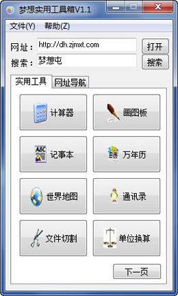 梦想屯实用工具箱包含计算器、画图板、记事本、万年历、世界地图、通讯录、文件切割等常用功能,还有网址导航模块,以及快速的网址访问、搜索功能。它可以随系统启动,为用户提供便捷的服务。