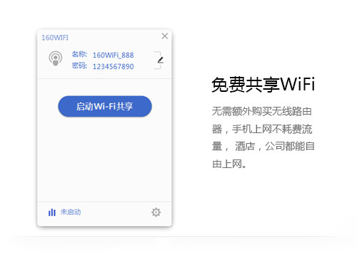 160wifi是一款免费共享wifi,支持所有随身wifi驱动,无需额外购买无线路由器,实现手机上网不耗费流量。酒店、公司都能自由上网。简单易用,无需任何的专业知识,无需任何的设置,一键操作完成所有设置。安全、稳定具备无线网卡的主流电脑均可使用,深度兼容Micrsoft Windows系统。