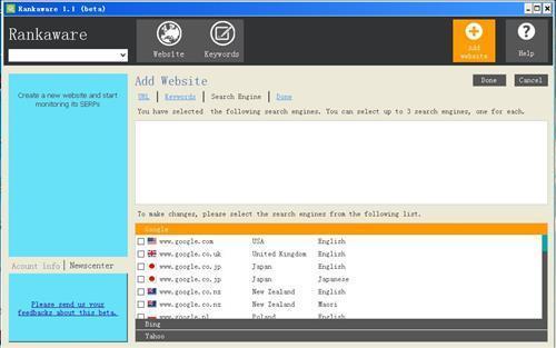 Rankaware是适用于网站站长的SEO工具,帮助你快速地检查和监视关键字的排名,支持Google, Yahoo, Bing 的关键字排名跟踪。