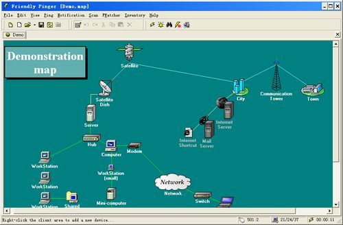 Friendly Pinger是一款方便的网络拓扑图制作软件,在软件上制作出完整的电子拓扑图之后,分析网络故障、日常维护、增减设备就更加直观方便了。Friendly Pinger无惧特大型网络,网络再大也能通过分类、嵌套的方式集成在一张图标,通过系统监测,如果发现问题,软件的左上角即显示出警告。软件能够通过申城的拓扑图轻松实现路由追踪、ping等命令,直观了解整体网络状态。