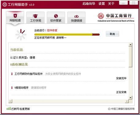 中国工商银行推出的网上银行客户端。该软件将引导您完成整个U盾证书驱动、个人网上银行控件以及系统补丁的安装。它能根据您的客户类型和当前环境进行自动检测,并依据全新软件清单智能指定安装计划,引导所需软件安装后浏览器设置,使您使用工行网银更加方便快捷。对于已经安装的软件,如果有新的版本,网银助手也将提醒您更新,以达到使用网银所需的最优环境配置。