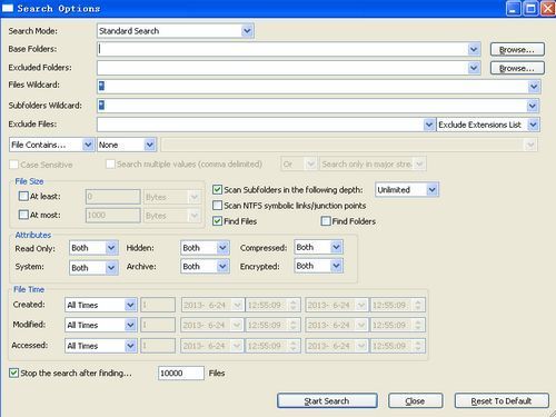SearchMyFiles是使用系统“搜索文件和文件夹”模块的另一选择。它可以使你很容易的通过通配符、后修改/创建/访问时间、文件属性、文件内容(文本或二进制搜索)和文件大小来搜索文件。